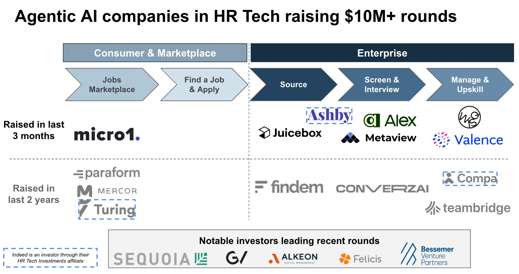 Agentic HR Tech is entering its breakout moment. Several companies in the space have raised $10M+ rounds in the past three months, suggesting that companies have found product market fit and are beginning to scale. Enterprise software startups are developing AI interviewers and coaches, autonomous candidate sourcing and outreach tools, and other self-directed HR capabilities. Marketplaces are developing AI-native workflows to drive faster and more efficient job matching, often serving the same AI labs whose models power their agentic features. Job-seeker applications are notably absent, despite many raising seed rounds.