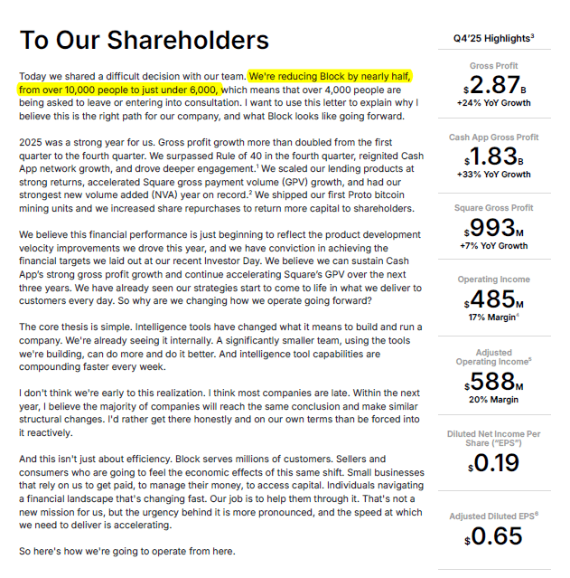 Last week Jack Dorsey, CEO of Block Inc. (makers of Square and CashApp) loudly announced plans to layoff 40% of its 10,000+ employees (4,000) and replace them with AI. The announcement was simple and there were few specifics about how this is going to take place.